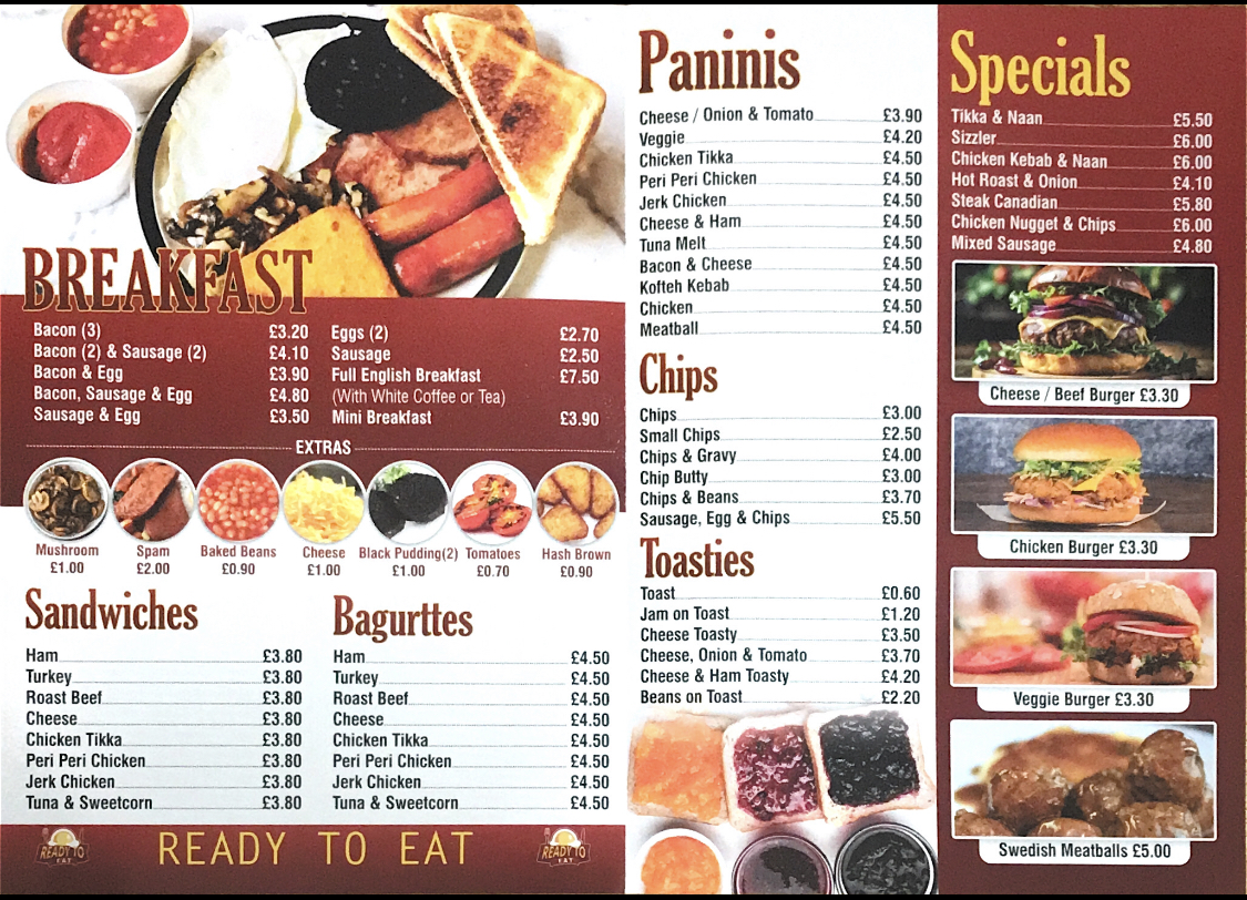 Ready To Eat offers a delightful range of classic British cafe fare, catering perfectly to breakfast lovers and lunch seekers alike. Mornings here start beautifully with their Full English Breakfast, a hearty plate priced at just £7.50. Imagine golden, crispy bacon and succulent sausages, perfectly paired with fluffy eggs that are simply begging to be devoured. And for those in need of a quicker bite, their Bacon & Egg sandwich is a steal at £3.90—ideal for a grab-and-go or a leisurely sit-down.